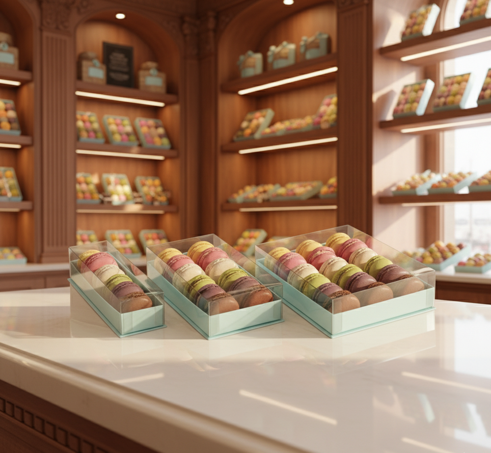 5pz Scatole Macaron coperchio trasparente e base colorata