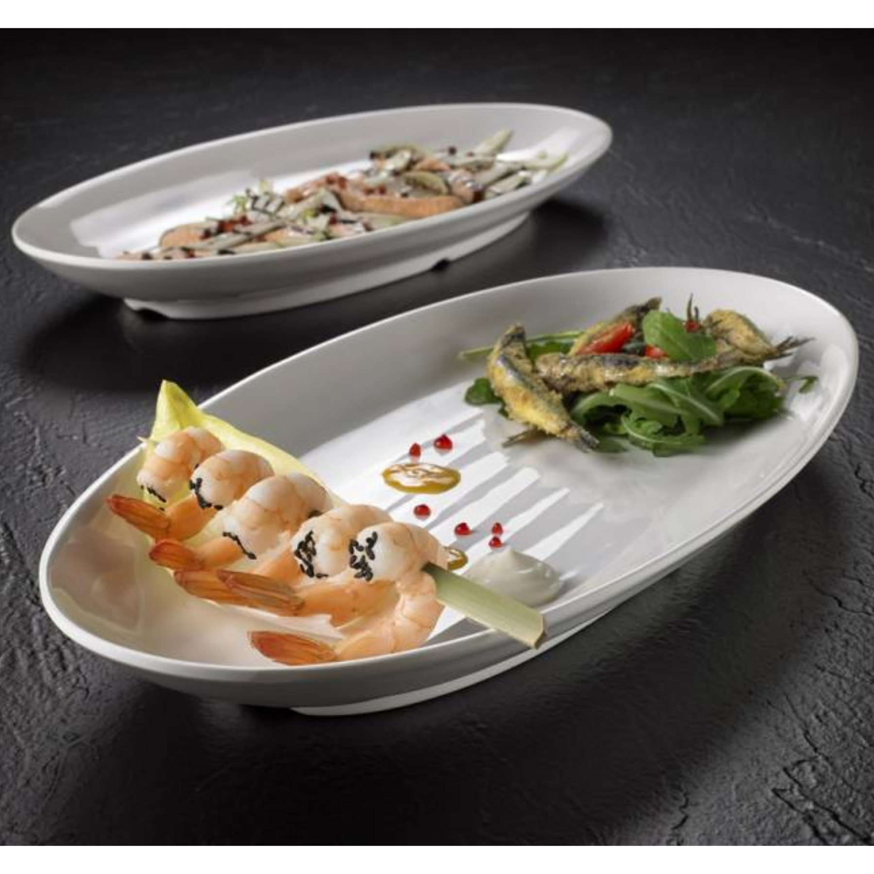 Il suo formato generoso 66 × 29 cm e il bordo rialzato da 6,3 cm permettono di esporre e servire preparazioni abbondanti: pesce intero, secondi piatti, antipasti, salumi, contorni, frutta e buffet. La forma ovale valorizza la presentazione dei cibi e si integra perfettamente negli allestimenti di hotel, ristoranti, catering e gastronomia da banco.