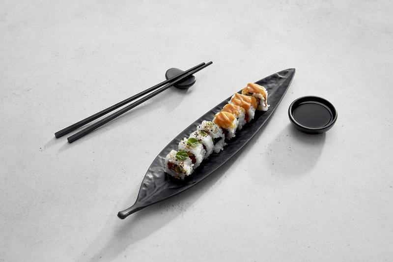 Piatto a forma di foglia in melamina, elegante e versatile, dal grande impatto estetico, ideale nella ristorazione professionale per dare un tocco originale e raffinato alla presentazione dei cibi.
