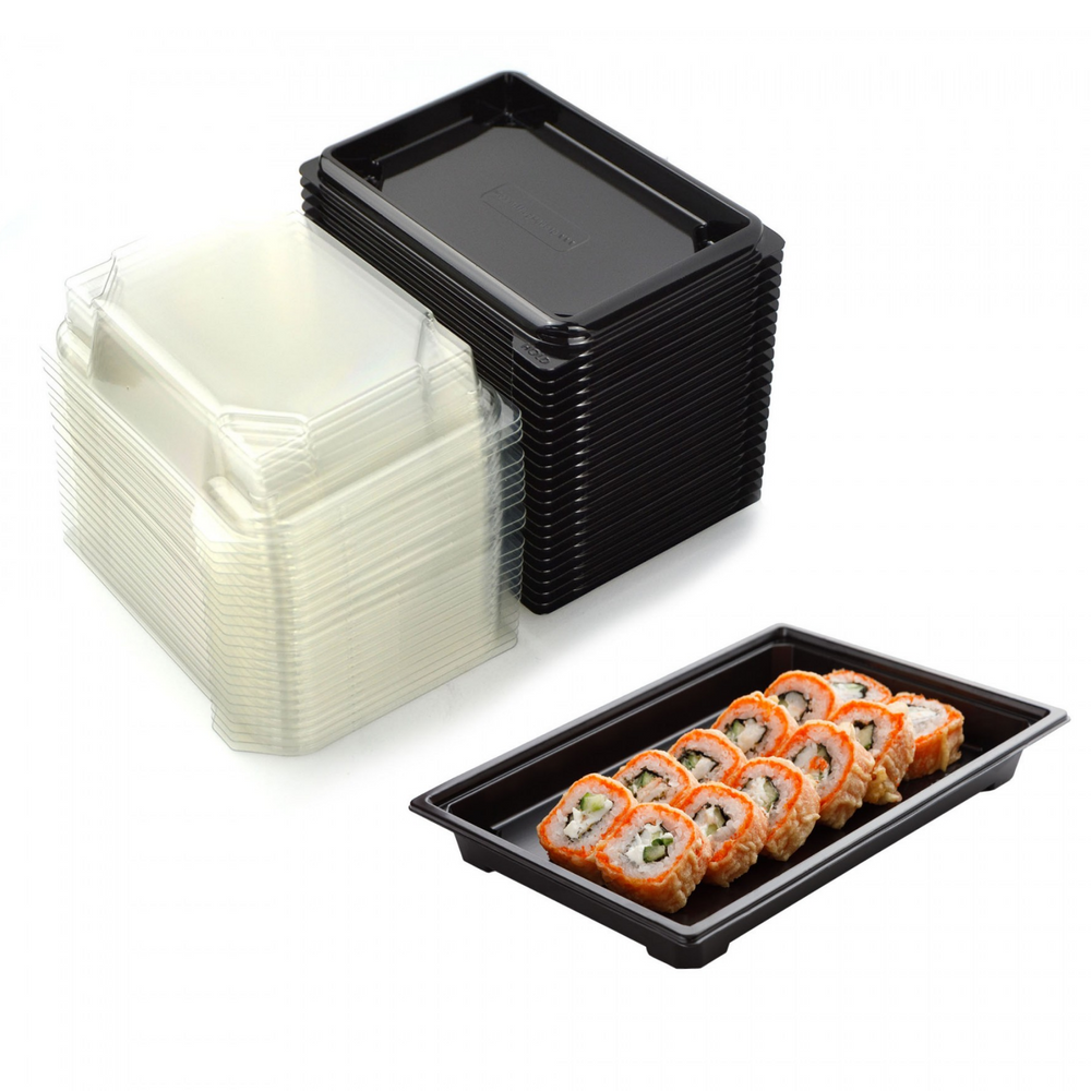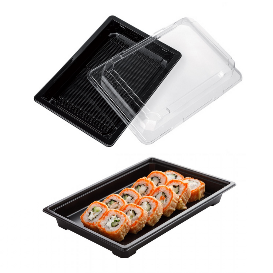 Contenitori sushi in PET riciclabili, contenitori per take-away eleganti, vaschette nere con coperchio trasparente, packaging per ristoranti giapponesi, contenitori per cibo da asporto riciclabili, vassoi sushi monouso, contenitori per gastronomia, vaschette per delivery, contenitori per frutta e antipasti, packaging monouso sostenibile per sushi.