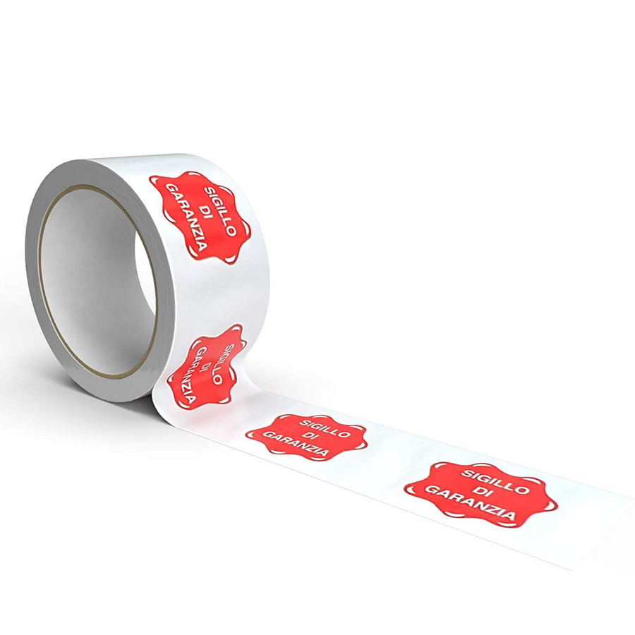 Nastri da imballo in PVC con svolgimento silenzioso di colore bianco, con stampa “SIGILLO DI GARANZIA” in colore rosso.