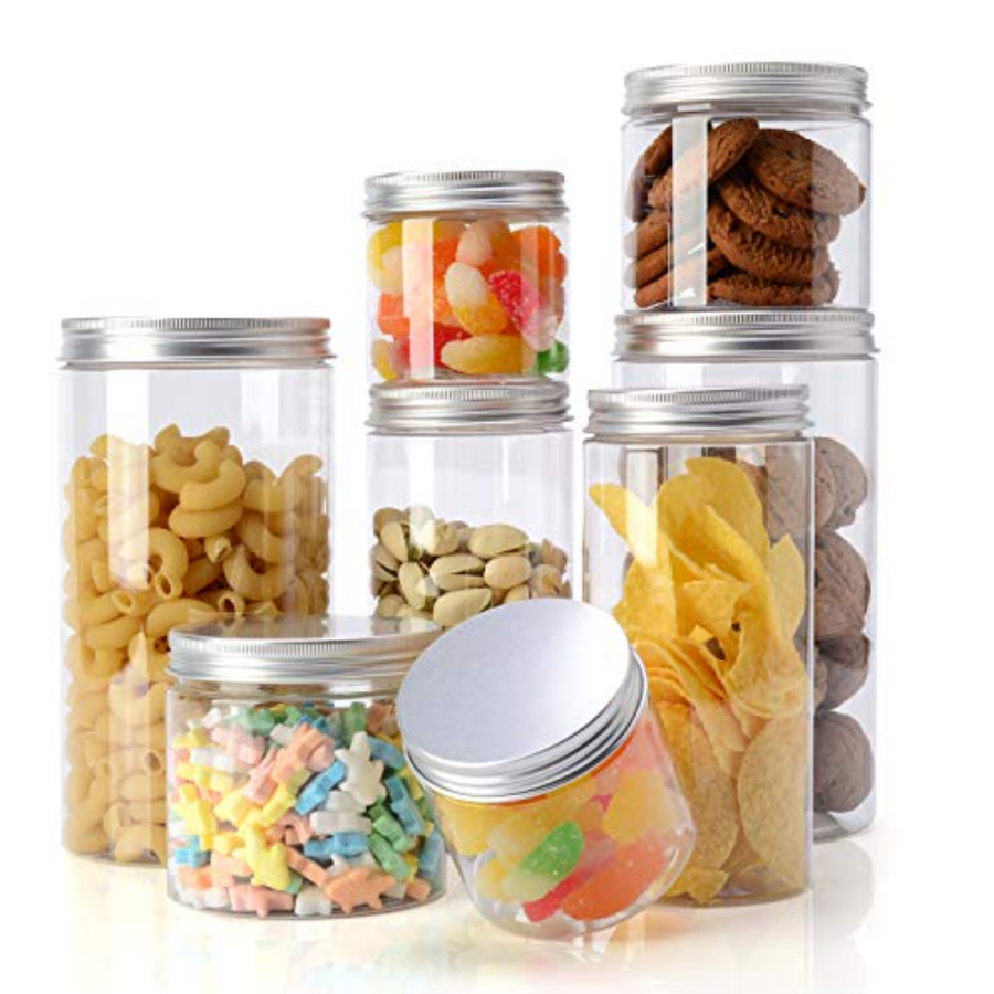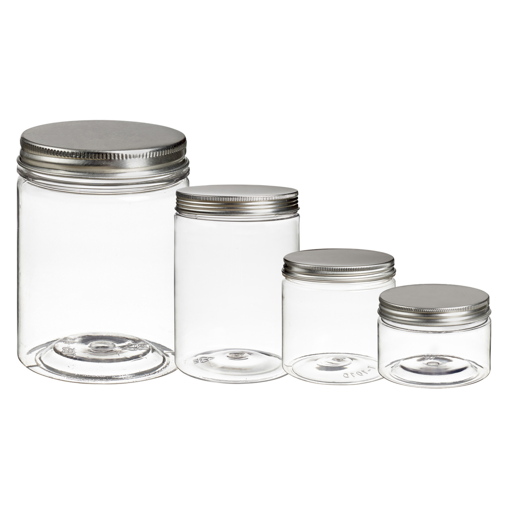 Varie dimensioni di Vasetti Cilindrici in PET trasparente con tappo a vite in alluminio argento