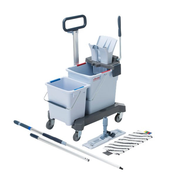 Kit completo di pulizia UltraSpeed Pro doppio ad elevate performance. Il kit pronto all'uso comprende chassis con ruote, secchio da 25 litri (per l'acqua di strizzatura), secchio da 8 litri (per l'acqua di lavaggio), telaio, mop in microfibra, pressa e manico telescopico in 3 pezzi. Il sistema più avanzato di Vileda Professional per la pulizia dei pavimenti a frangia piatta unisce le elevate performance della microfibra dei mop a un comodo sistema di strizzatura, per ottenere pavimenti asciutti più velocemente. Il secondo secchio da 8 lt è stato progettato per permettere il montaggio della pressa centralmente o posteriormente. L'esclusivo profilo impedisce il gocciolamento dell'acqua tra i secchi in qualsiasi configurazione. Adatto a tutti i tipi di pavimento, ma anche alla pulizia di pareti verticali e soffitti.