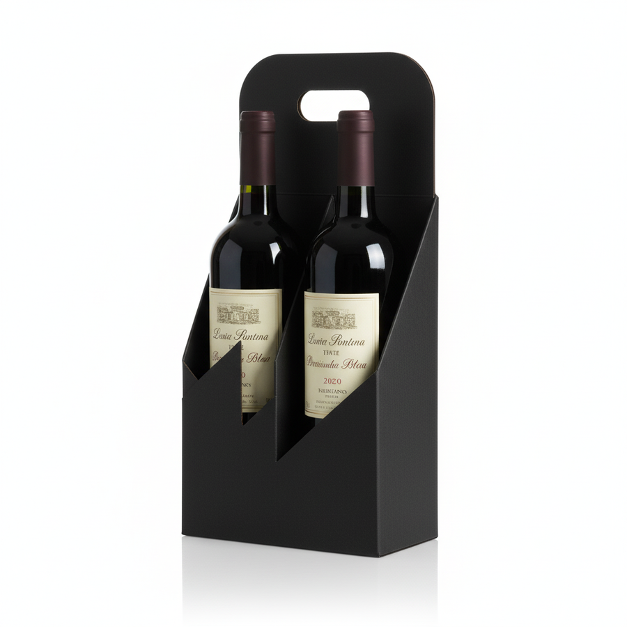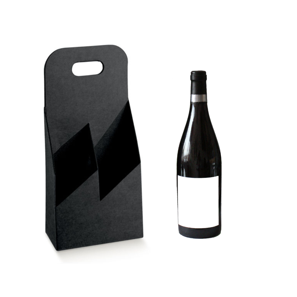 Realizzato in cartone kraft nero ad alta grammatura, con maniglia fustellata per una presa comoda e sicura, questo cestello è pensato per contenere 2 bottiglie standard di vino, birra o olio, tenendole ben separate e protette grazie al pratico divisorio interno.