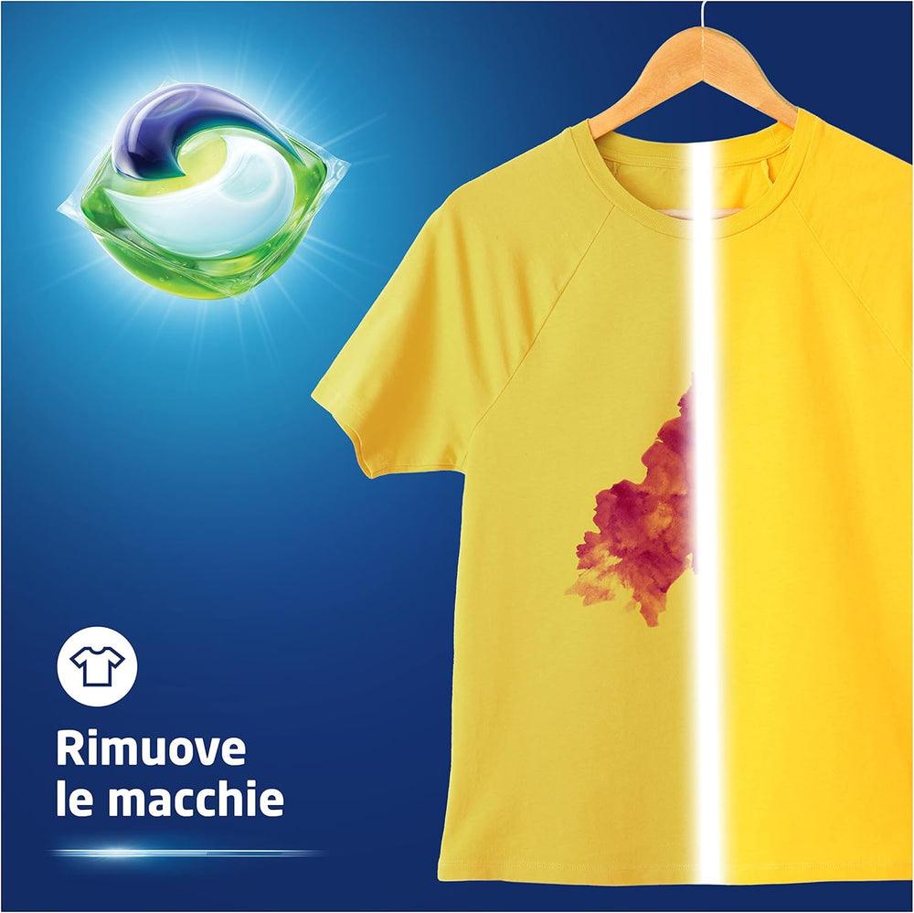 Grazie alla tecnologia pre-dosata, ogni pod contiene la giusta quantità di detergente, attivi sbiancanti e agenti antiodore per trattare efficacemente capi bianchi e colorati, assicurando prestazioni elevate anche a basse temperature.