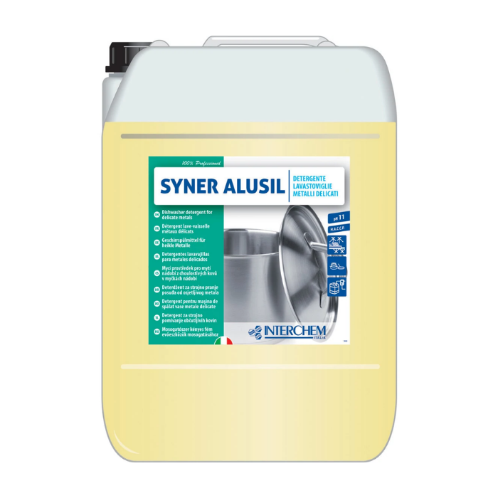 Detergente liquido specifico per il lavaggio meccanico di stoviglie in alluminio e posateria in argento. È consigliato effettuare un prelavaggio prima del suo impiego in macchina. La presenza di particolari sequestranti mantiene inalterato il suo potere sgrassante anche in presenza di acque molto dure (sup. a 25°F).