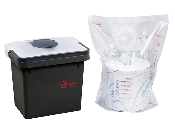 Dispenser SafePlus Vileda per panni imbevuti, dispenser per MicronRoll Maxi, sistema igienico per panni disinfettanti, dispenser professionale Vileda con coperchio antibatterico, dispenser per pulizia superfici ospedaliere, panni in microfibra disinfettanti, panni imbevuti Vileda Professional, dispenser monouso per panni microfibra.