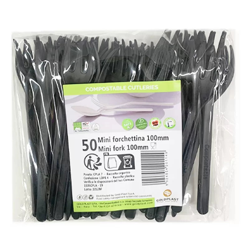 Mini forchettine CPLA compostabili, forchettine nere finger food, posate biodegradabili monouso, forchettine ecologiche 10 cm, forchettine compostabili per aperitivi, posate sostenibili da buffet, forchette CPLA per catering, forchettine eleganti per eventi, posate monouso per finger food, forchette in bioplastica per degustazioni.