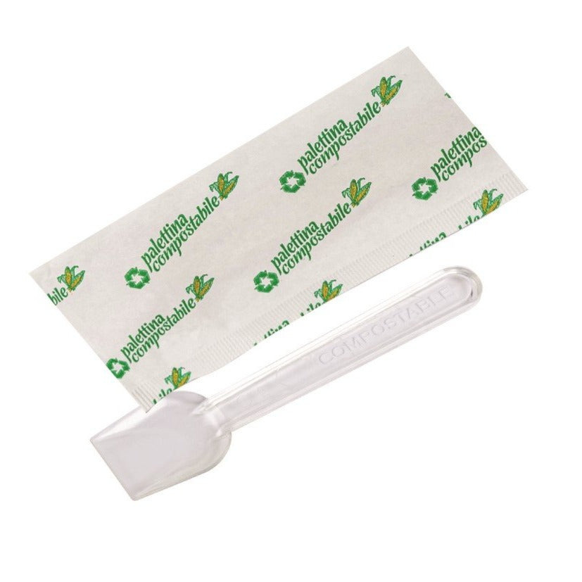 Palettine gelato CPLA imbustate, posate compostabili singole 9cm, palette biodegradabili per gelato, palettine monouso biocompostabili, cucchiaini monouso ecologici, palette gelato confezionate singolarmente, accessori gelateria sostenibili, palette in CPLA per dessert, palette monouso igieniche per gelato, posate monouso per take-away eco-friendly.