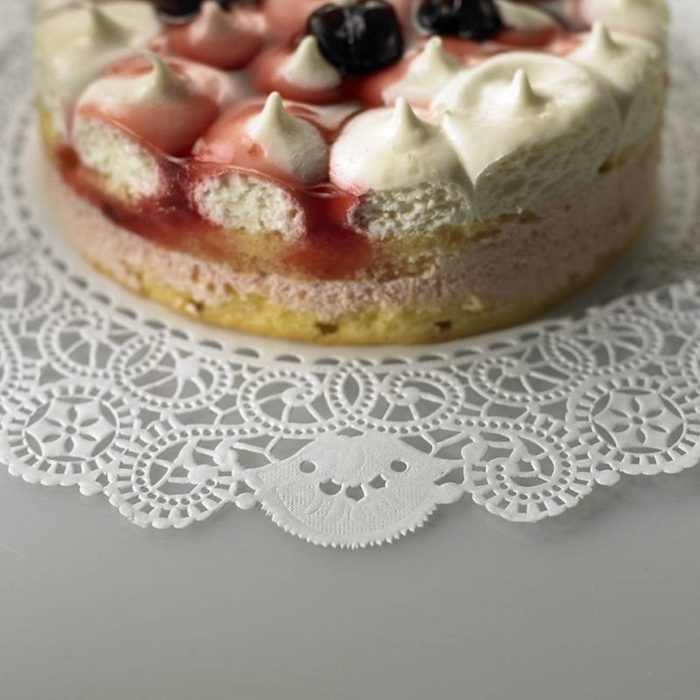 Pizzo Pasticceria Tondi centrini sottotorta in carta bianca antigrasso certificata per il contatto con gli alimenti.