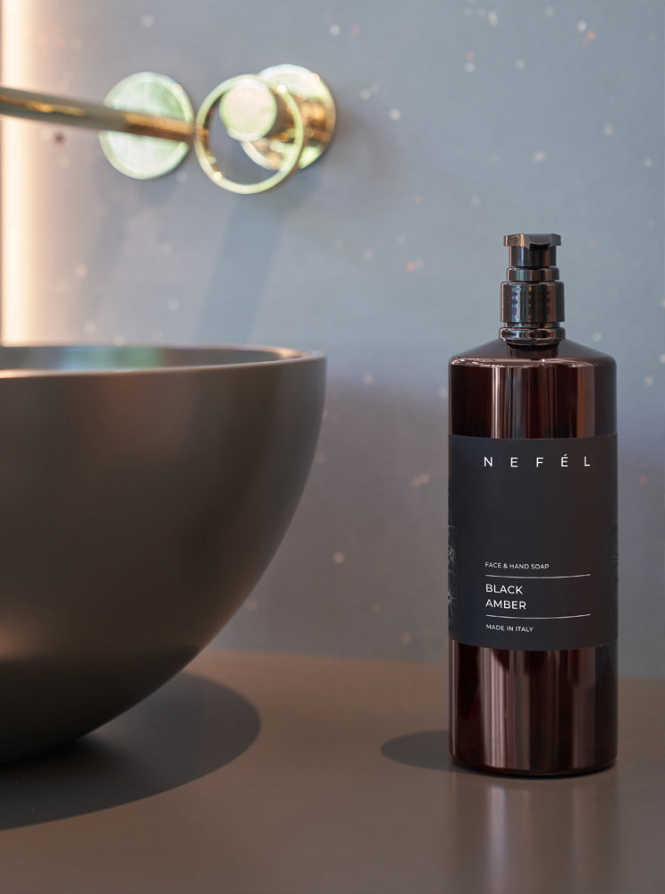 Oltre alla sua eccellenza formulativa, Nefél Black Amber Face & Hand Soap si distingue per un packaging minimalista ed elegante, pensato per valorizzare ogni ambiente bagno.