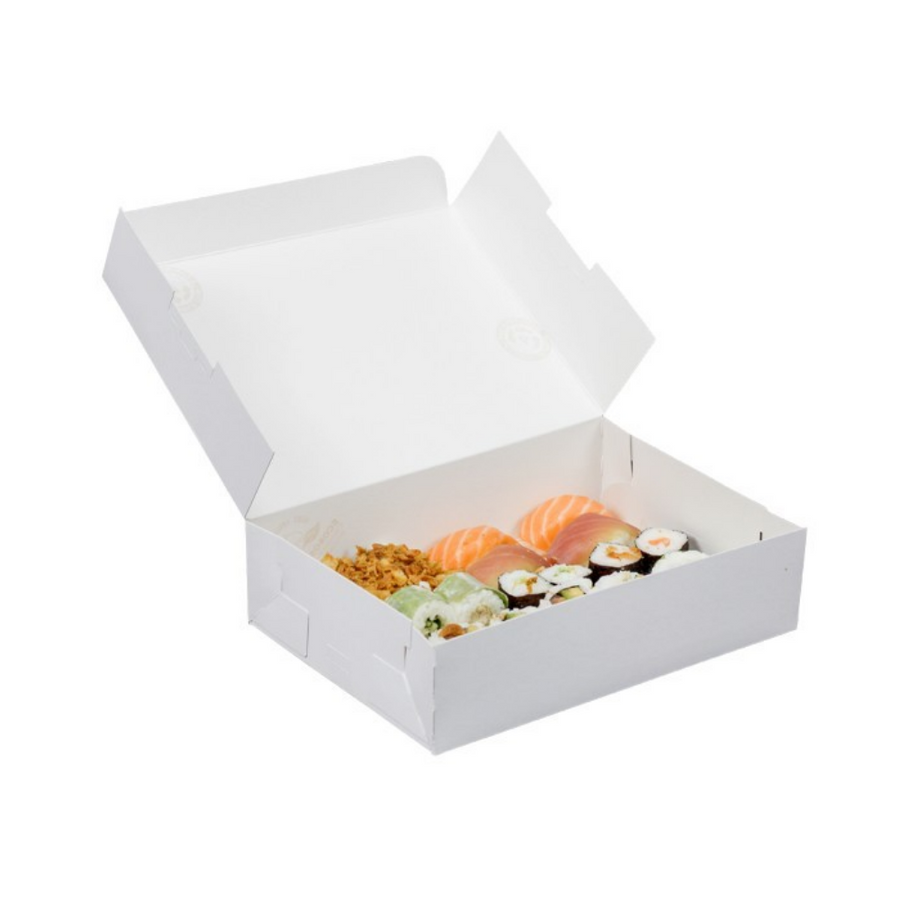 Le Scatole Scrigno Bianche per Asporto Alimentare uniscono praticità, resistenza e design elegante, garantendo un servizio professionale e sicuro per ogni esigenza di delivery e take-away.