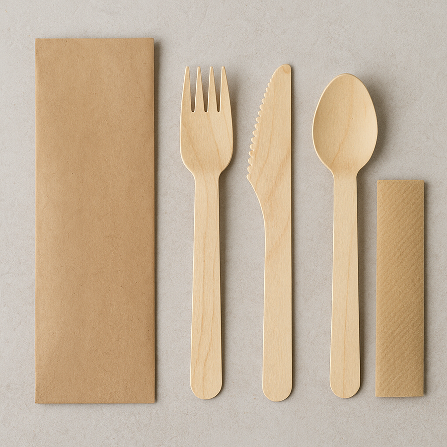 ✔ Set completo: Forchetta + Coltello + Cucchiaio in legno naturale + Tovagliolo Avana 33x33 cm