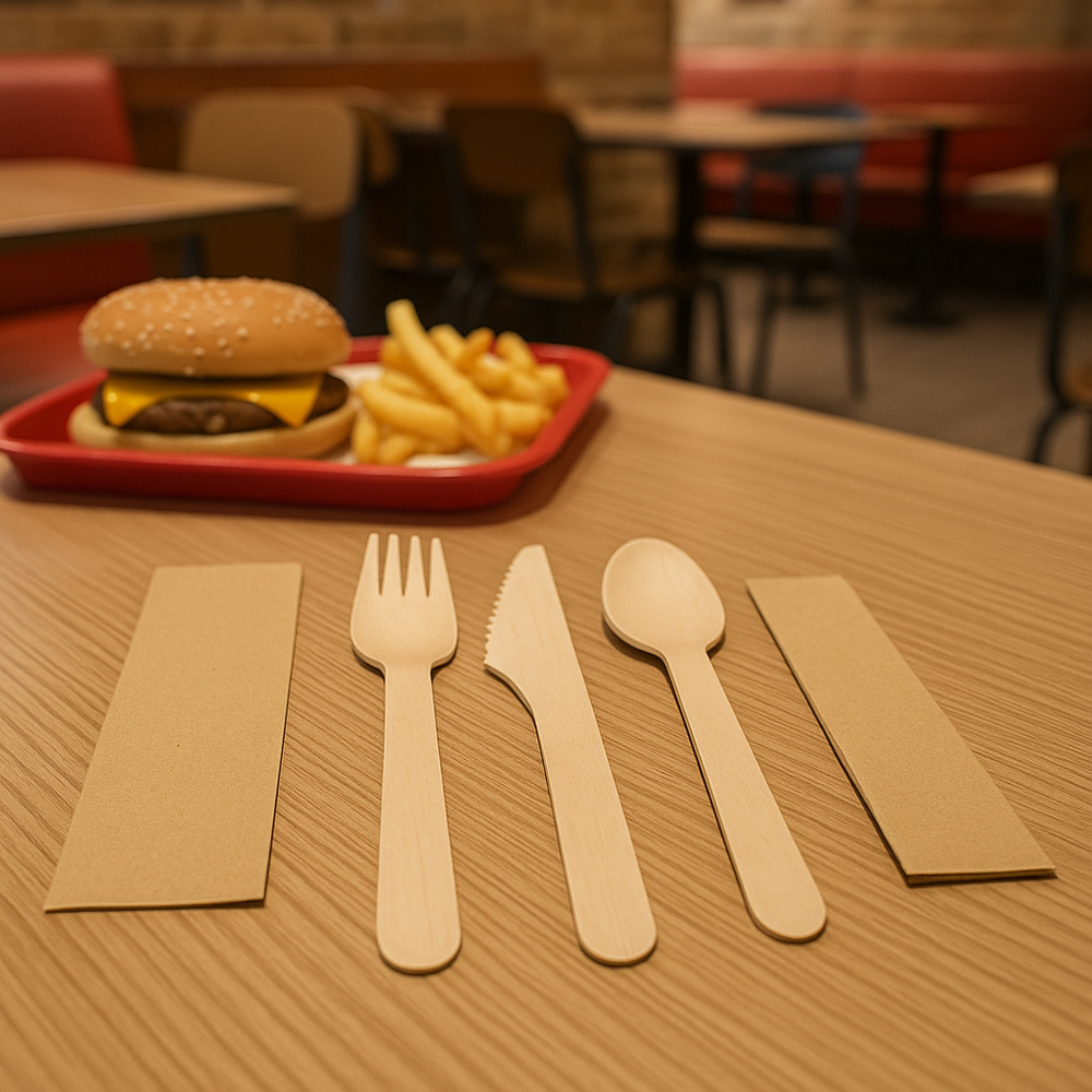 Offri un servizio eco-sostenibile e di alta qualità con il Tris Posate in Legno + Tovagliolo, confezionato singolarmente per garantire la massima igiene e praticità. Ogni kit contiene forchetta, coltello e cucchiaio in legno di betulla naturale, accompagnati da un tovagliolo in pura cellulosa 33x33 cm piegato, perfetto per un servizio elegante e funzionale.