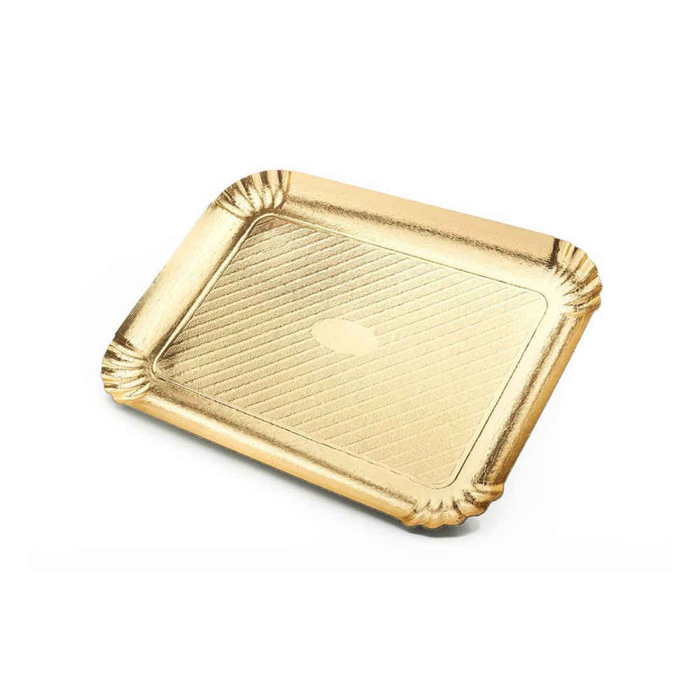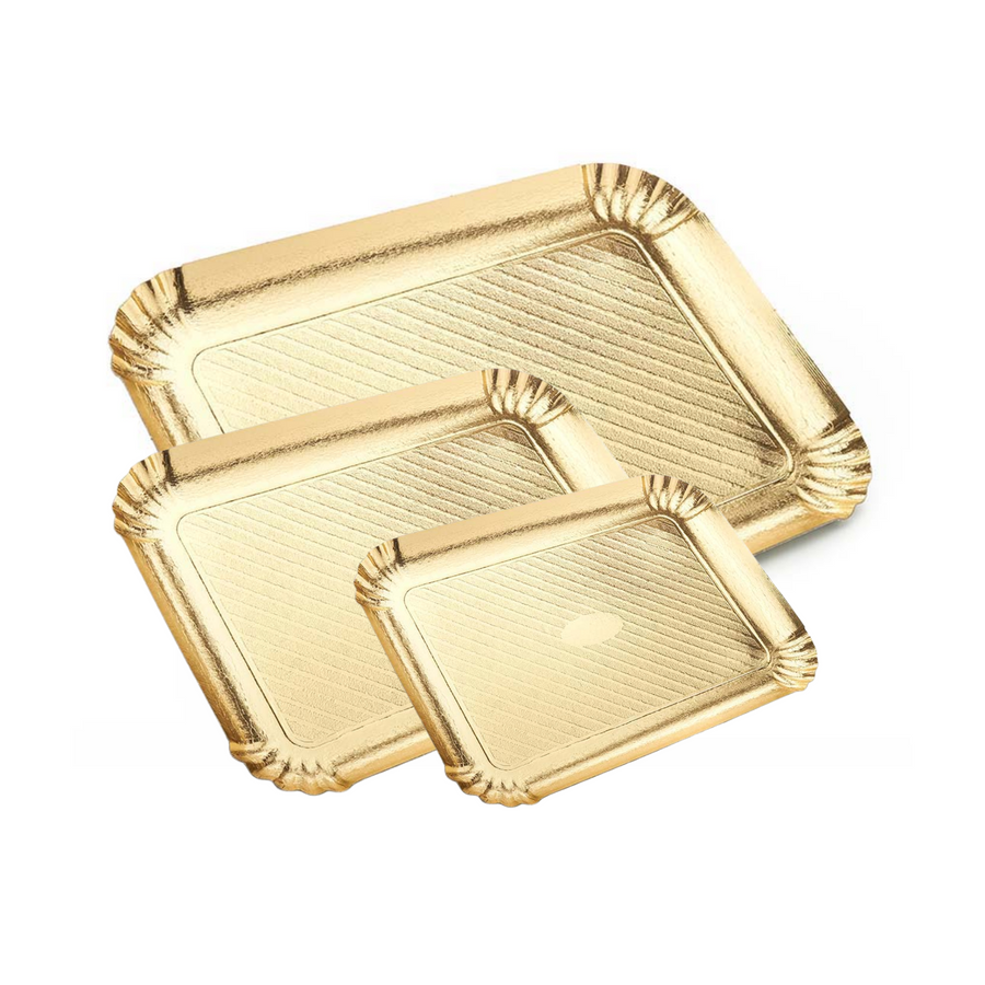 Vassoi dorati per alimenti disponibili in varie misure. Idonei al contatti diretto con alimenti anche unti e oleosi.